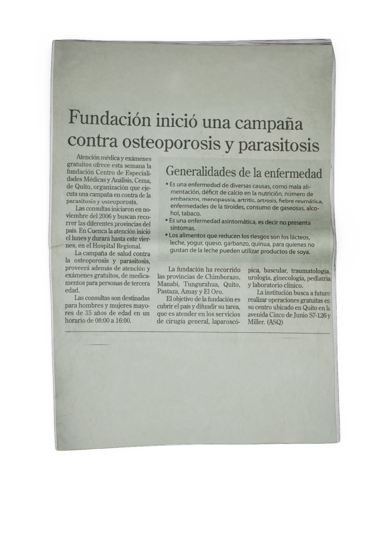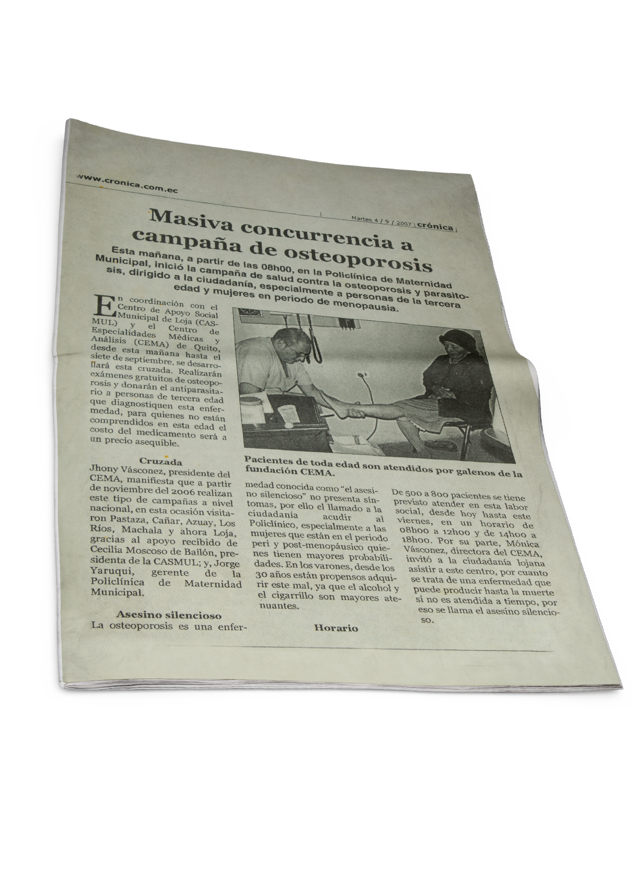CEMA inició desde el año 2002 como un consultorio que brindaba servicios de medicina general, a partir del 2006 mediante alianzas estratégicas empieza a recorrer casi todas las provincias del Ecuador, realizando campañas médicas de Control de la Osteoporosis y Parasitosis, donando a la vez calcio y antiparasitarios a todas las personas que se atendían con nosotros; luego en el 2019 aparece la pandemia del COVID-19 a la que enfrentamos (Dra. Mónica Vásconez y Med.Alt Jhony Vásconez) salvando la vida a muchos pacientes uniendo el tratamiento convencional (antibiótico, anticoagulantes y Anti inflamatorios ) + medicina alternativa ( Dióxido de Cloro y Biomagnetismo Médico) obteniendo como resultado más de 2.500 personas que recuperaron la salud en un cien por ciento.